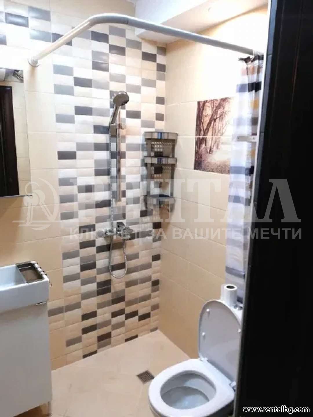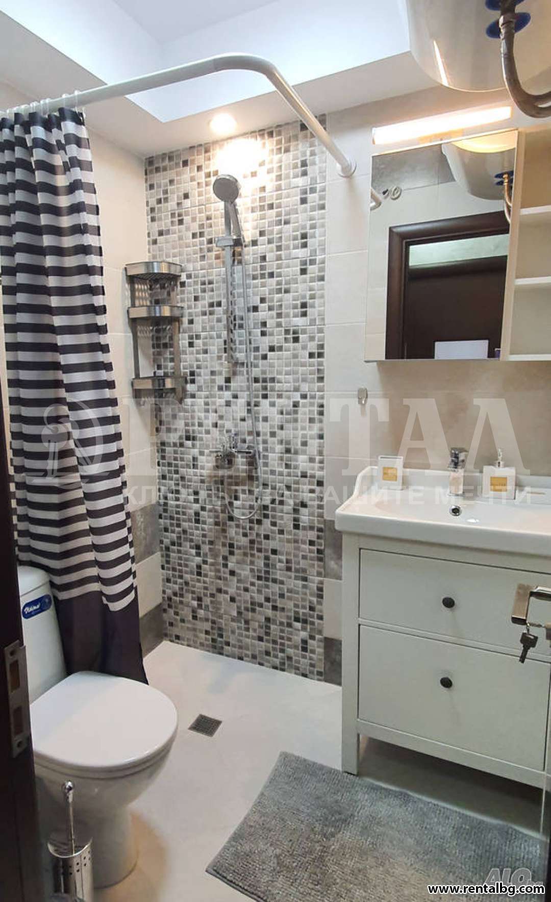 Банята, която е с изключителен теракот, разполага с удобен и красив душ, който е допълнително осветен, удобна мивка с голям шкаф за съхранение, шкаф с огледало и допълнителни полици.