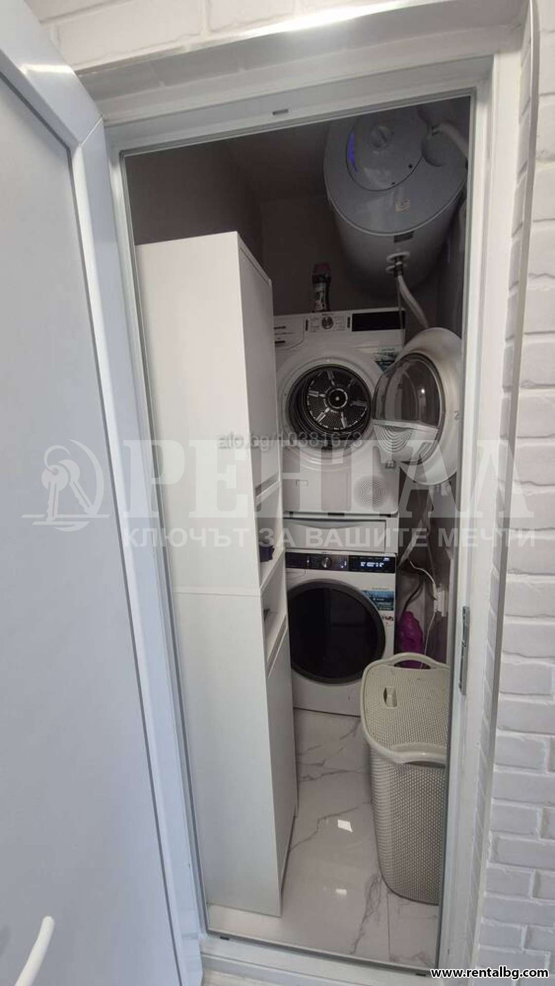 Разпределение: входно антре, просторен хол с кухненски бокс, две спални, баня с тоалетна, отделна тоалетна, перално помещение и две тераси. Напълно обзаведен и готов за нанасяне. Отопление: електрическо - климатик във всяка стая