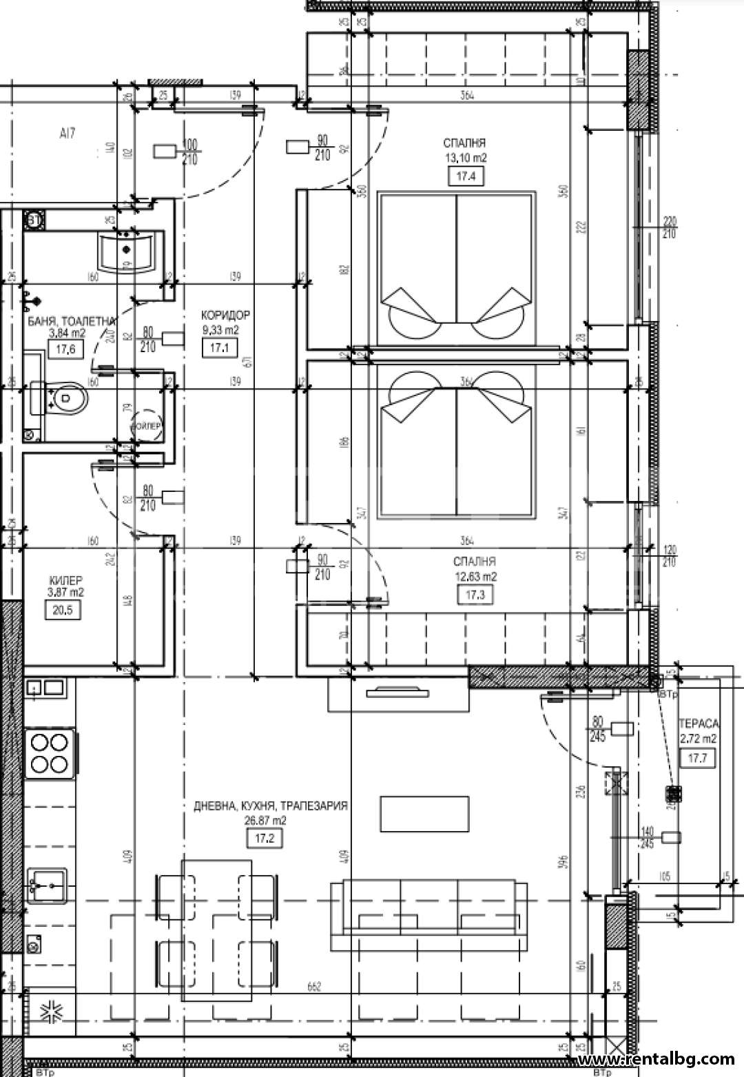 оферта 254183 Дневна с трапезария и кухненски бокс-27кв.м, 2 спални по 13кв.м всяка, баня с wc, мокро помещение, което може да се направи лесно на в ...