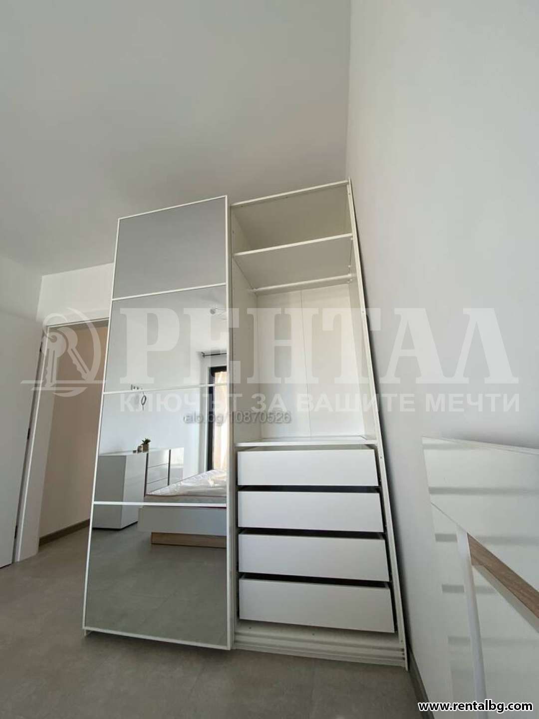 Разпределение: входно антре, хол с кухненски бокс, спалня, баня с тоалетна, две тераси.