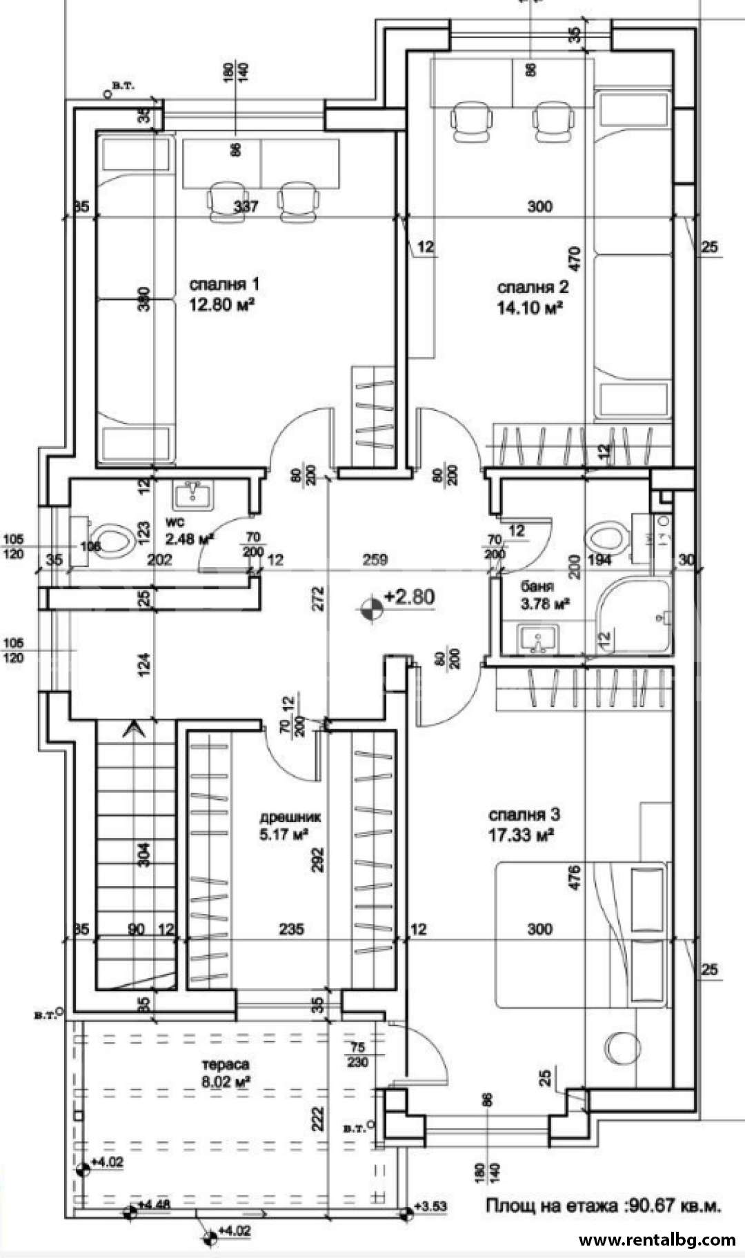 ет.1-85 кв.м. голям и просторен хол с кухненски бокс ,входно антре , тоалетна и веранда.Вторият етаж 92кв.м. се състои от ,голяма родителска спалня с тераса ,голяма баня , тоалетна и голямо гардеробно помещение , има и още две детски спални .