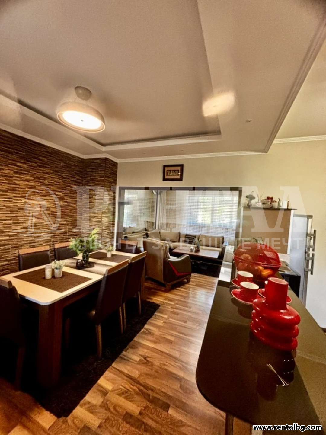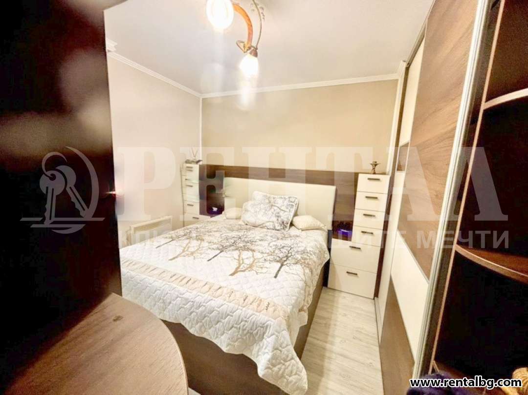 Апартаментът (96 кв.м) предлага перфектен баланс между комфорт, стил и удобство. Състои се от модерно обзаведен хол с напълно оборудван кухненски бокс и обширна трапезария, две самостоятелни спални, тоалетна, перално помещение и баня, две остъклени тераси и входно антре. Оборудван е с всички необходими електроуреди: пералня, съдомиялна, сушилня, хладилник, печка, микровълнова, стъклокерамичен котлон, електрическа кана, бойлер, климатик, телевизор, интернет и цифрова телевизия. Има блиндирана входна врата. Намира се в тих район, на пешеходно разстояние (около 3 минути) до Lidl, зеленчуков пазар, търговски център, парк, аптека, автобусна спирка, бензиностанция, училище и детска градина. Изложение север/юг.
