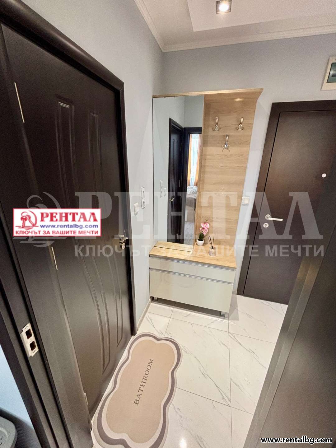 Апартаментът се състои от просторен хол с кухненски бокс, спалня с излаз към обща тераса, която свързва и двете помещения, баня с тоалетна и коридор. Към имота има и прилежащо избено помещение, както и удобно паркомясто, включено в наема.